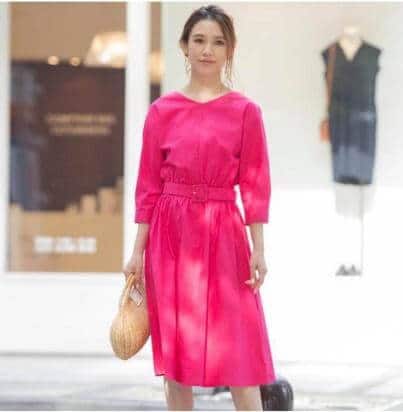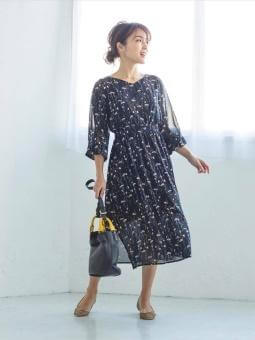 花柄とベルトのウエストマークで、女性らしく上品なワンピースです。全体のシルエットがすごく綺麗。デザインとしては30代後半~40代向けかな。
